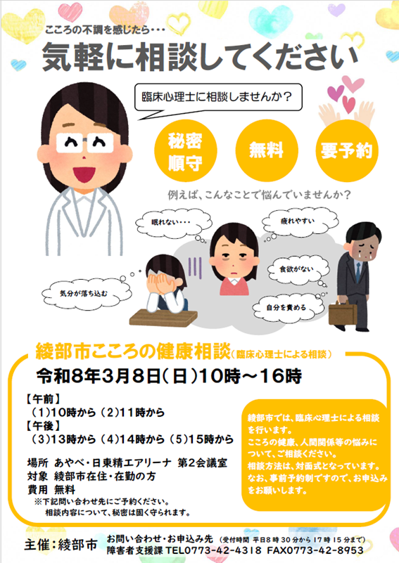 綾部市では、こころの健康、⼈間関係等の悩みについて、臨床⼼理⼠による相談を⾏います。相談⽅法は、対面式となっています。なお、事前予約制ですので、お申込みをお願いします。