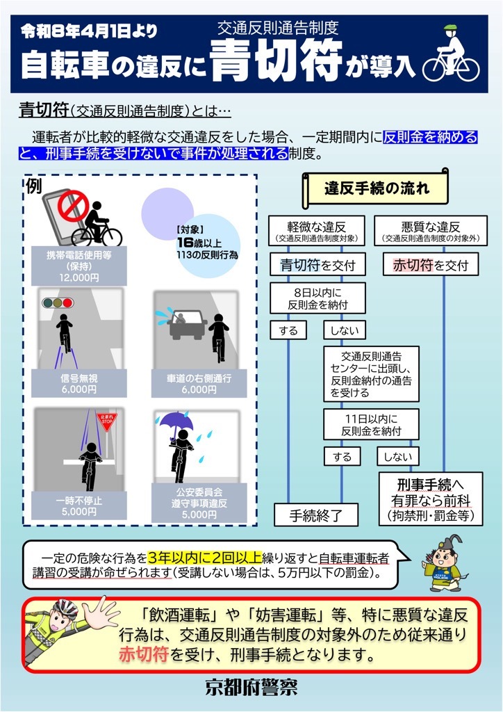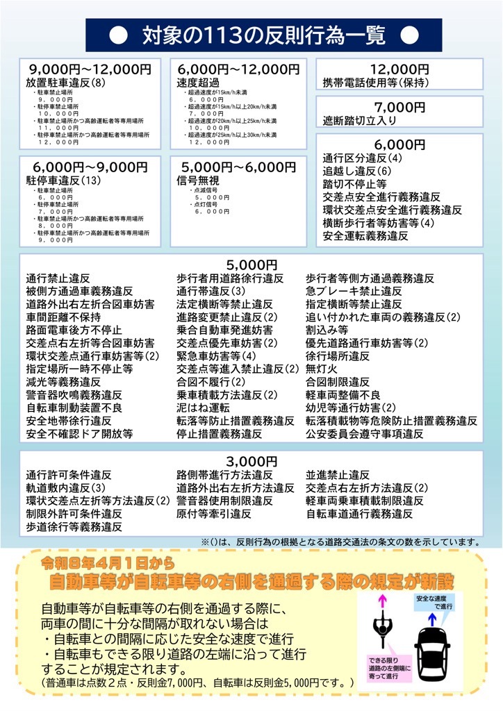 令和8年4月1日から、信号無視や右側通行、ながらスマホなどの悪質で危険な違反に対して、青切符(交通反則通告制度)が導入されます。